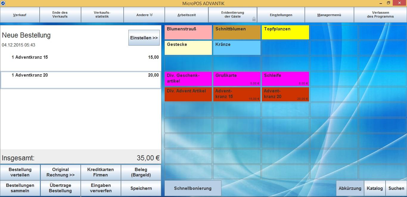 Auf dieser Oberfläche werden die verschiedenen Artikel boniert und abgerechnet. Zahlung Bar/ Bankomat/ Kreditlarte/ Kundenkarte/ Lieferschein/ Sammelrechnung einfach und schnell möglich.